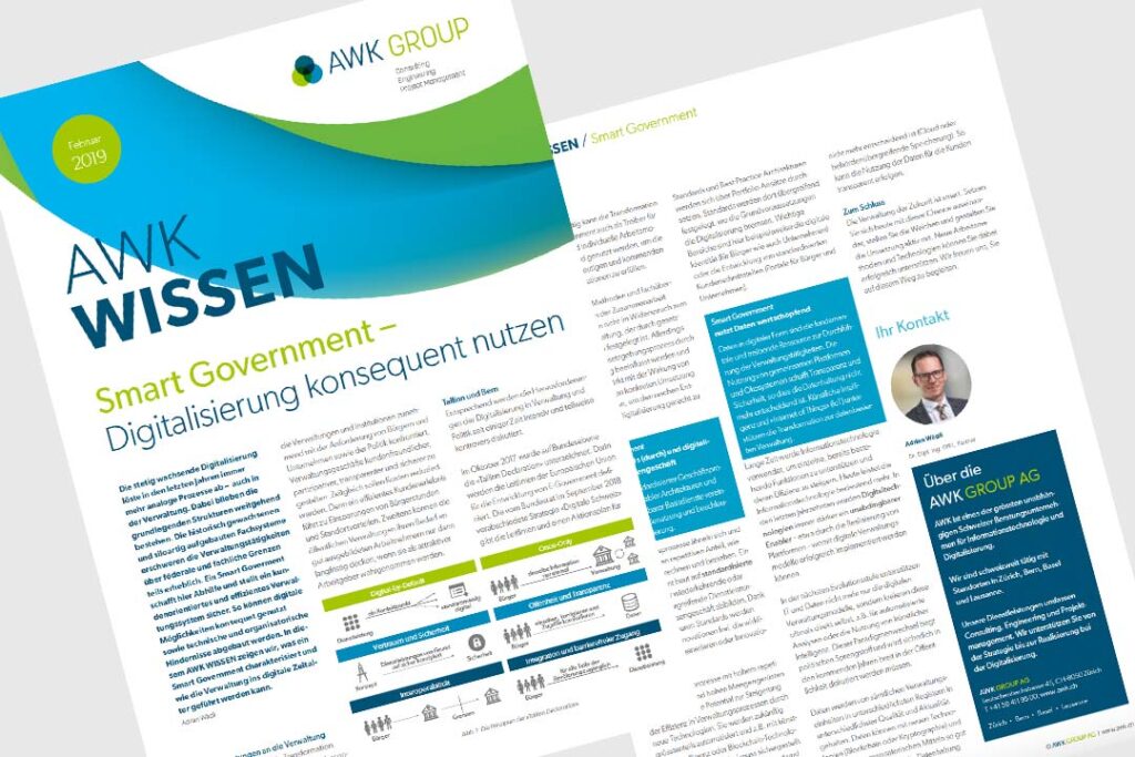 Das Schweizer Beratungsunternehmen AWK Group aus Zürich-Oerlikon publiziert mehrmalsim Jahr die umfangreiche Broschüre «AWK Fokus» sowie das etwas kürzere Faktenblatt «AWK Wissen». Im Frühjahr 2019 hat mir die AWK Group die Aufgabe anvertraut, eine Broschüre zum Thema Customer Centricity sowie ein Faktenblatt zum Thema Smart Government zu erstellen.