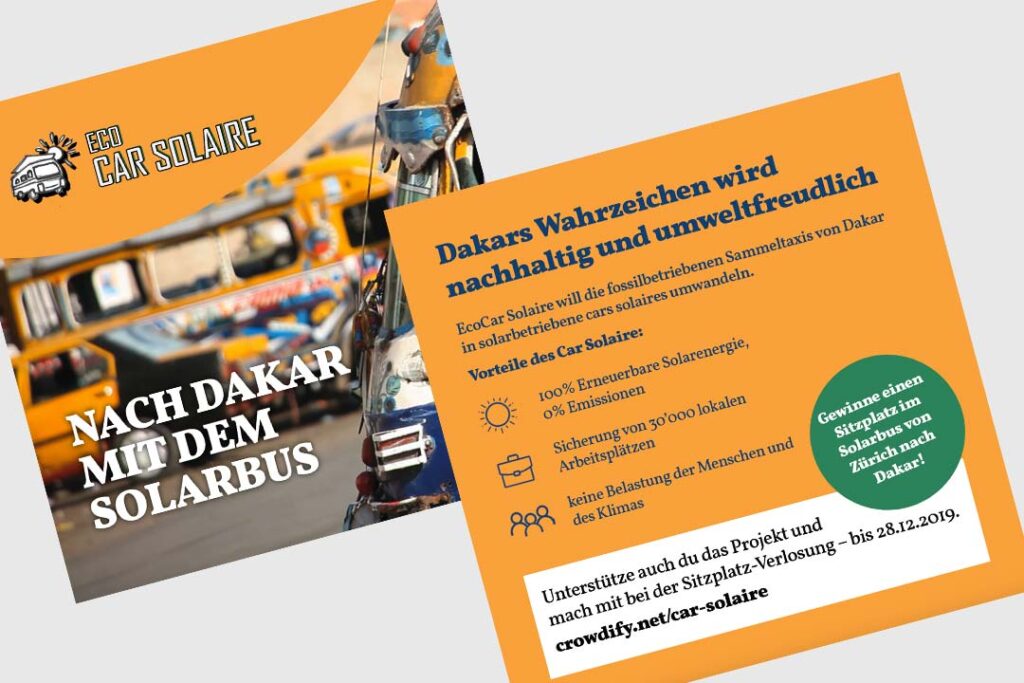 Eco Car Solaire war mein erstes ehrenamtliches Projekt. Die Idee dahinter ist spannend: EcoCar Solaire möchte mit innovativer und klimafreundlicher Technik die kunstvoll verzierten «cars rapides» in Senegals Hauptstadt Dakar in solarbetriebene und umweltfreundliche Transportmittel verwandeln. Um das Projekt zu finanzieren, lancierte Mandu dos Santos Pinto eine Crowdfunding-Kampagne.